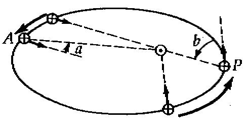 The first of the two factors that can affect the length of the Mean Solar Day is how the Earth revolves around the Sun. The Earth's orbit is slightly elliptical to the Sun. In this exagerated diagram P denotes when the Earth is at perihelion, the closest approach to the Sun, and A when it is furthest away at aphelion. When the Earth is closer to the Sun, such as at perihelion, it will travel faster in it's orbit. In the diagram at perihelion, the Earth has travelled the arc of the arrow in the time it takes to rotate 360 degrees around it's axis and must still revolve through angle b to complete the apparent solar day. Thus the apparent solar day is longer for this time of year. At aphelion the Earth still has the angle a to rotate through at the end of the arc, but since that angle is not as great the time will not be as much for that part of the year.