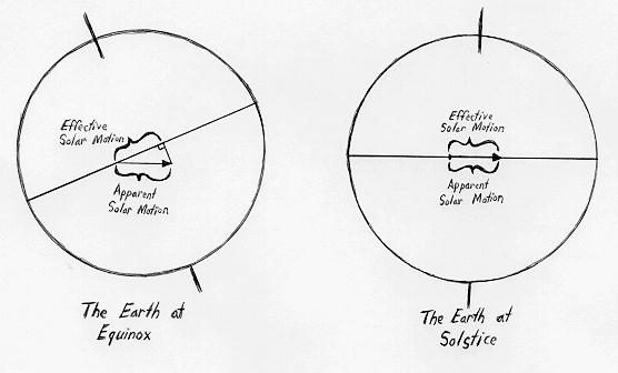 The other factor is the tilt of the Earth's axis to the Sun. Only the apparent motion of the Sun parallel to the Earth's equator affects the apparent solar day. At each of the equinoxes this factor will be the least, and it has the strongest effect on the solstices of the year. This diagram shows the contrast between the apparent motion of the Sun to the effectual movement for both of these times of the year. On the Equinoxes only the part of the Sun's apparent motion parallel to the Earth's equator, the Effective solar motion, has an effect on the mean solar day. For the solstices, where nearly all of the Sun's apparent motion is along the Earth's equator the effect is stronger.